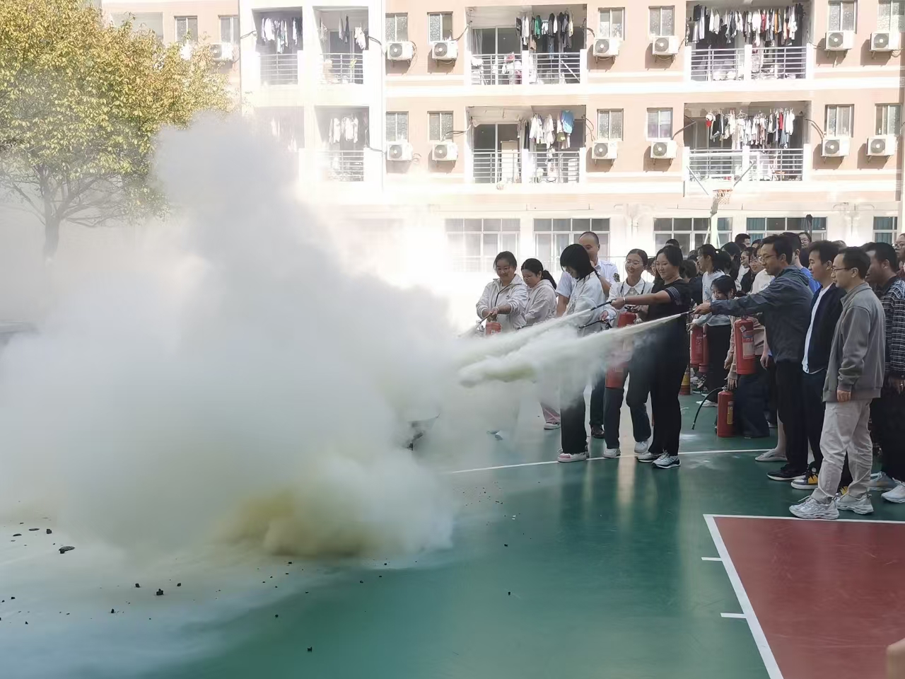 本次活动涵盖学生应急疏散演练、消防安全知识培训、模拟火灾逃生、灭火实操演练等多项内容。应急疏散演练环节,模拟学生公寓某寝室突发火情,工作人员和同学们迅速响应,有序完成灭火救援和撤离工作。消防安全知识培训环节,培训老师结合生动的案例开展警示教育,并现场讲解了灭火器使用方法、火灾中的应急逃生方法和初级火灾处置过程。