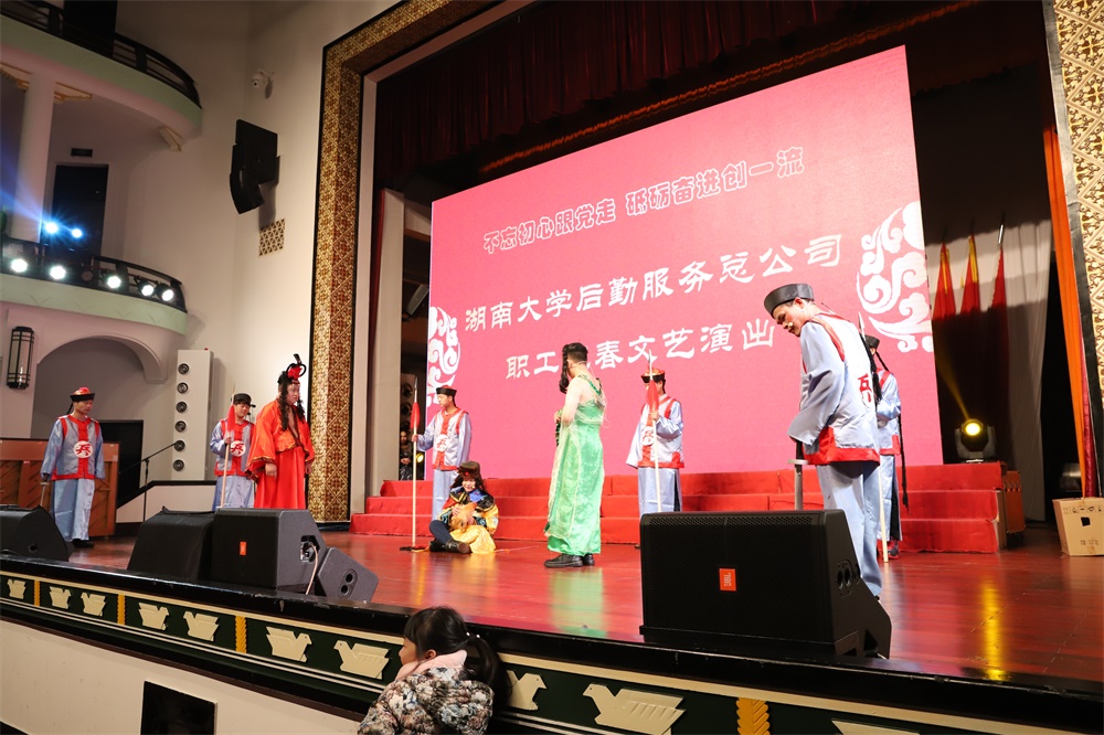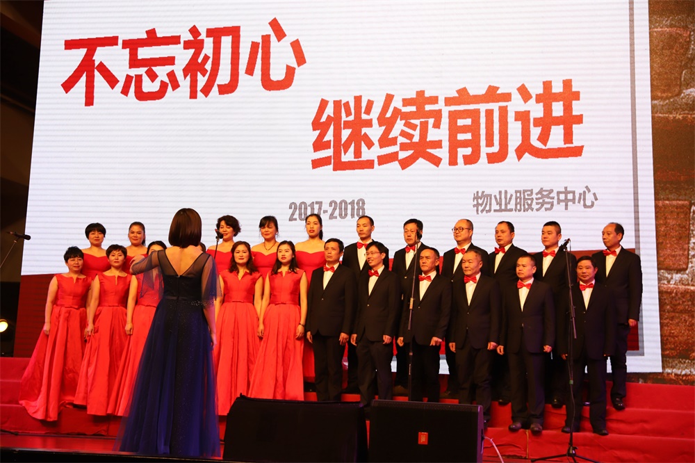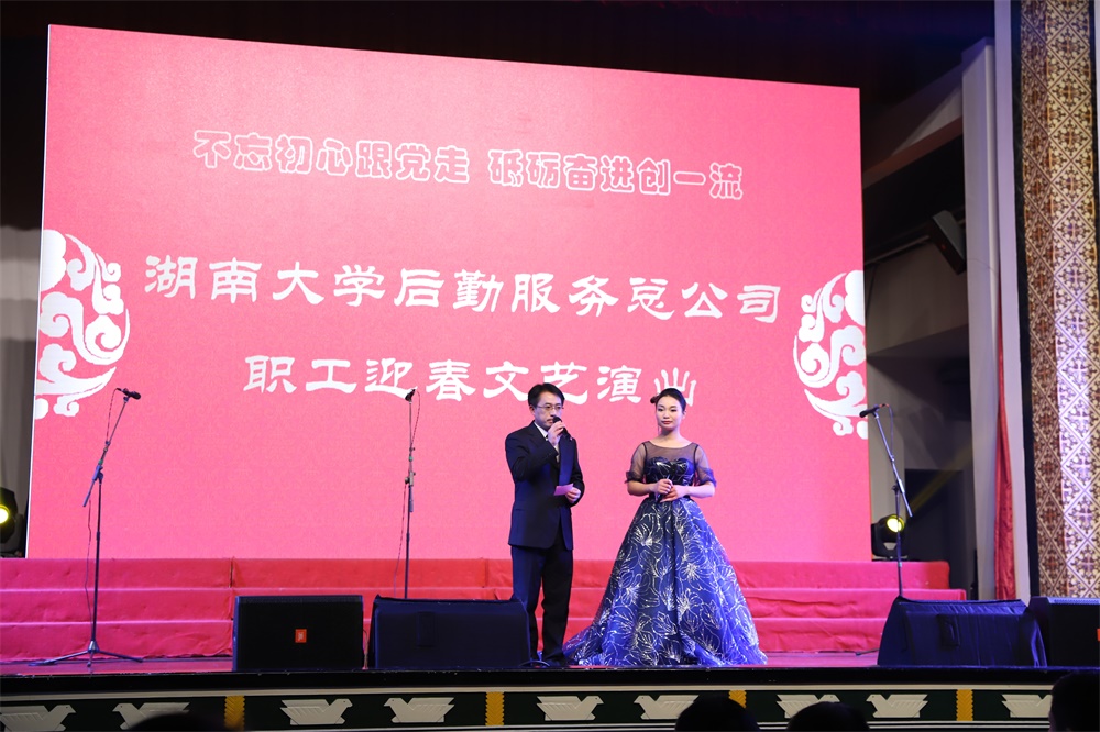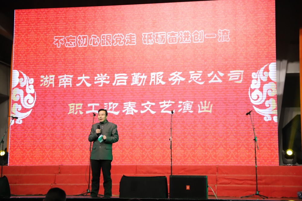 晚会开始,李久学总经理首先发表了致辞,对2017年度后勤服务总公司的重要工作进行了回顾,对在暑期抗洪救灾和正在进行的抗冰防灾工作中辛勤付出的后勤系统人员致以诚挚的慰问和感谢。随后,晚会演出在物业中心表演的大合唱《不忘初心》中拉开序幕,总公司职能部门联合出演的诗朗诵《我们的中国梦》赞颂了湖大后勤人的新风貌、新气象,通讯中心的小品《娭毑来交费》将工作场景搬上舞台,水电中心男生小合唱《当那一天来临》歌声嘹亮、气势雄壮,饮食中心在职和退休老职工联合演出的舞蹈《唱支山歌给党听》唱出了全体后勤人的心声,通讯中心表演的舞蹈《掀起你的盖头来》、接待中心带来的各国服装秀《遇见最美的你》让观众感受到了浓郁的地方色彩和异域风情,集贤宾馆的小品《霸王别鸡》博得了全场阵阵笑声,集贤宾馆大合唱《中国中国鲜红的太阳永不落》抒发了后勤员工砥砺奋进跟党走的豪迈情怀……