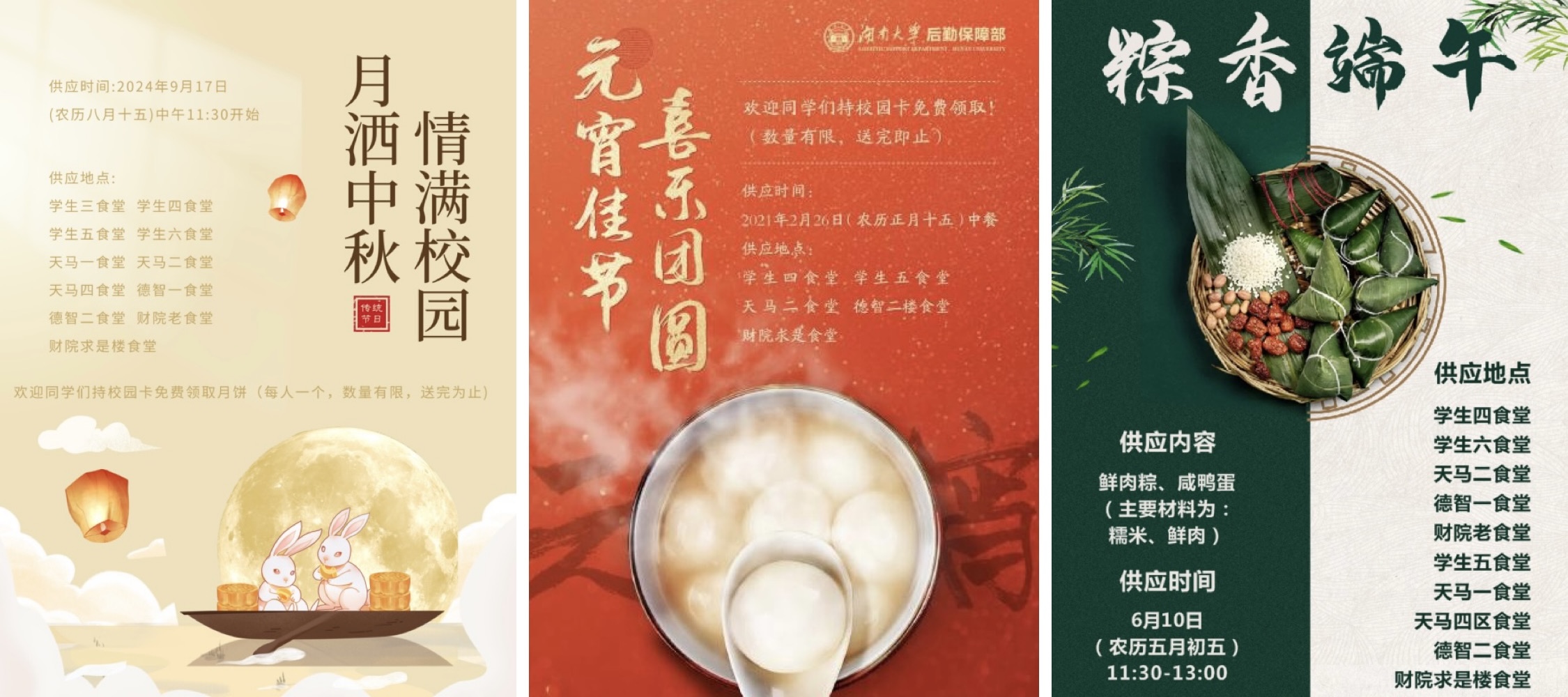 在传统节日之际,食堂以“舌尖上的节日”“走进中华传统节日”等为主题,为学生提供传统食品。推送活动海报,讲好节日故事,让学生了解节日起源及习俗。